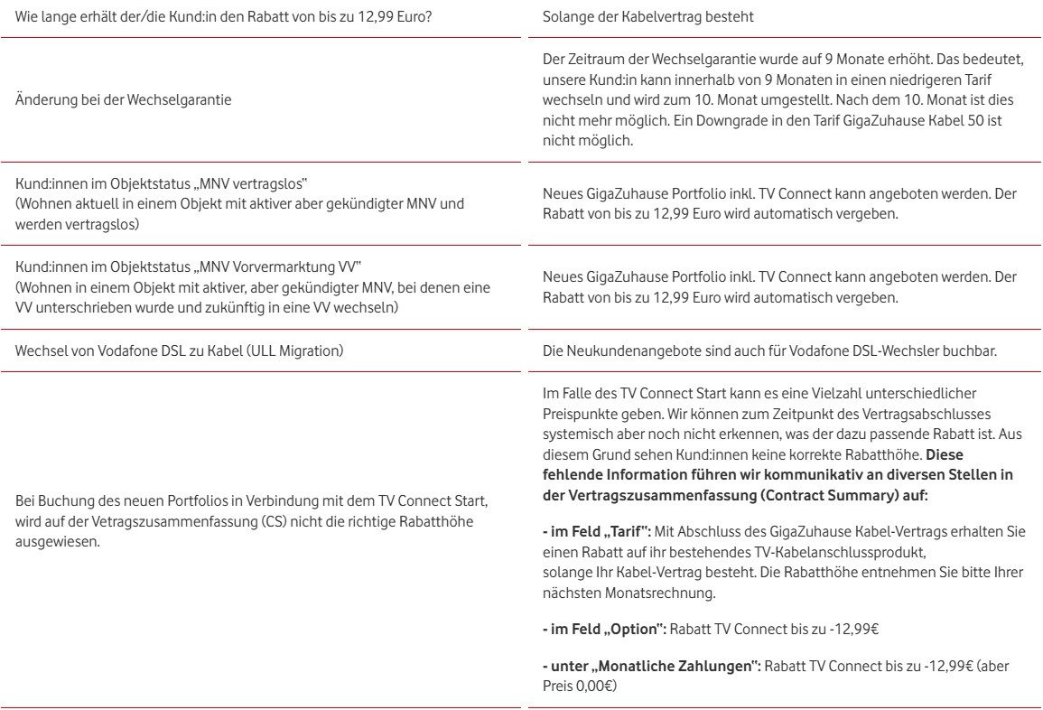 Kabel-Bestandskund:innen können in die neuen Internet-Tarife wechseln und erhalten auf Wunsch ein kostenloses TV-Kabelanschluss. TV-Bestandskund:innen behalten ihr bisheriges Produkt und erhalten bei Abschluss eines neuen GigaZuhause Kabel-Tarifs einen Rabatt von bis zu 12,99 € auf ihren bestehenden TV-Kabelanschluss. Der Rabatt gilt solange der Vertrag zum GigaZuhause Kabel-Tarif aktiv ist. Im Fokus stehen diese Kund:innen, die bereits ein KIP-Produkt haben, aber kein TV-Kabelanschluss Produkt oder die bereits ein TV-Kabelanschluss haben, aber kein KIP-Produkt.